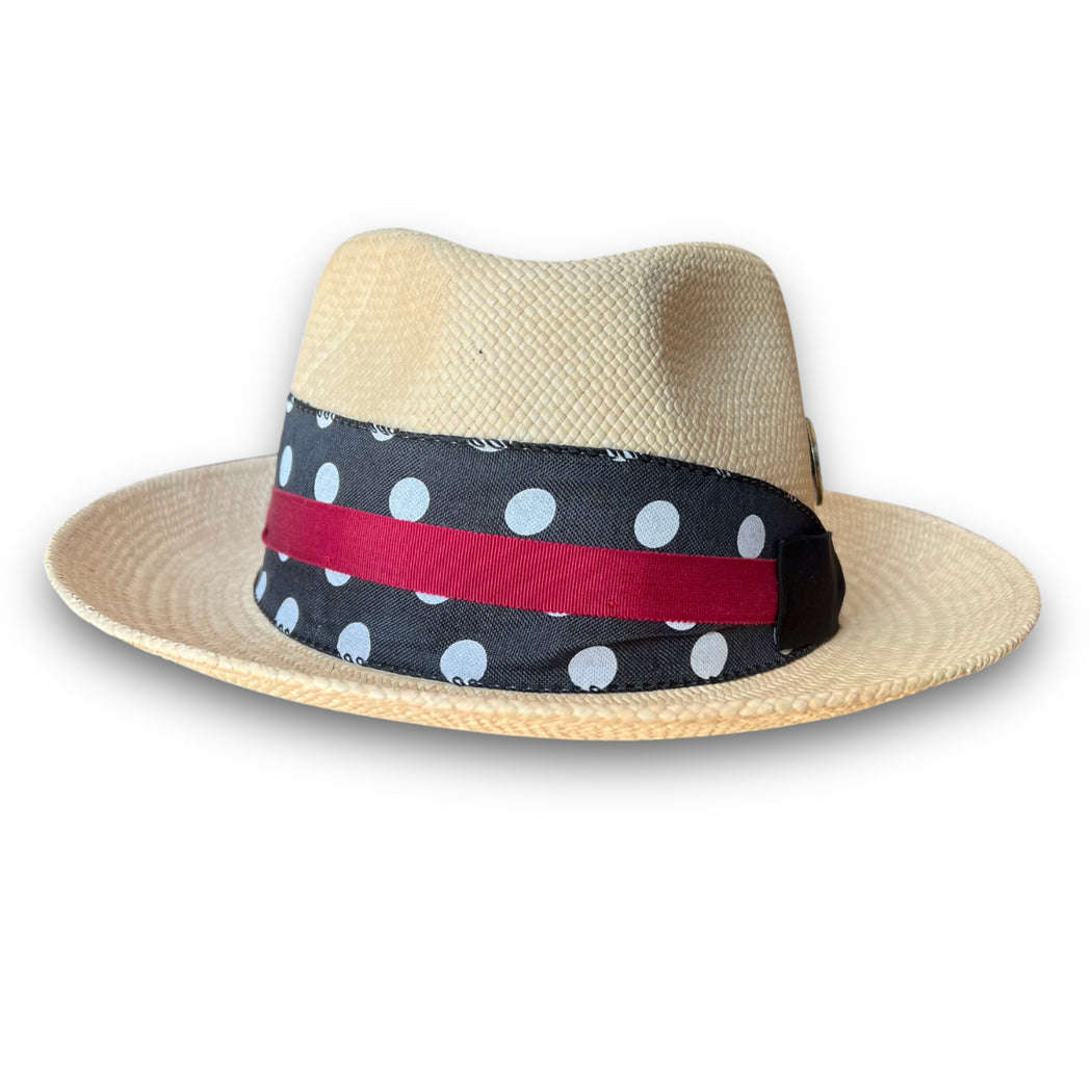 • Black and white polka dot grosgrain ribbon band with a splash of crimson red